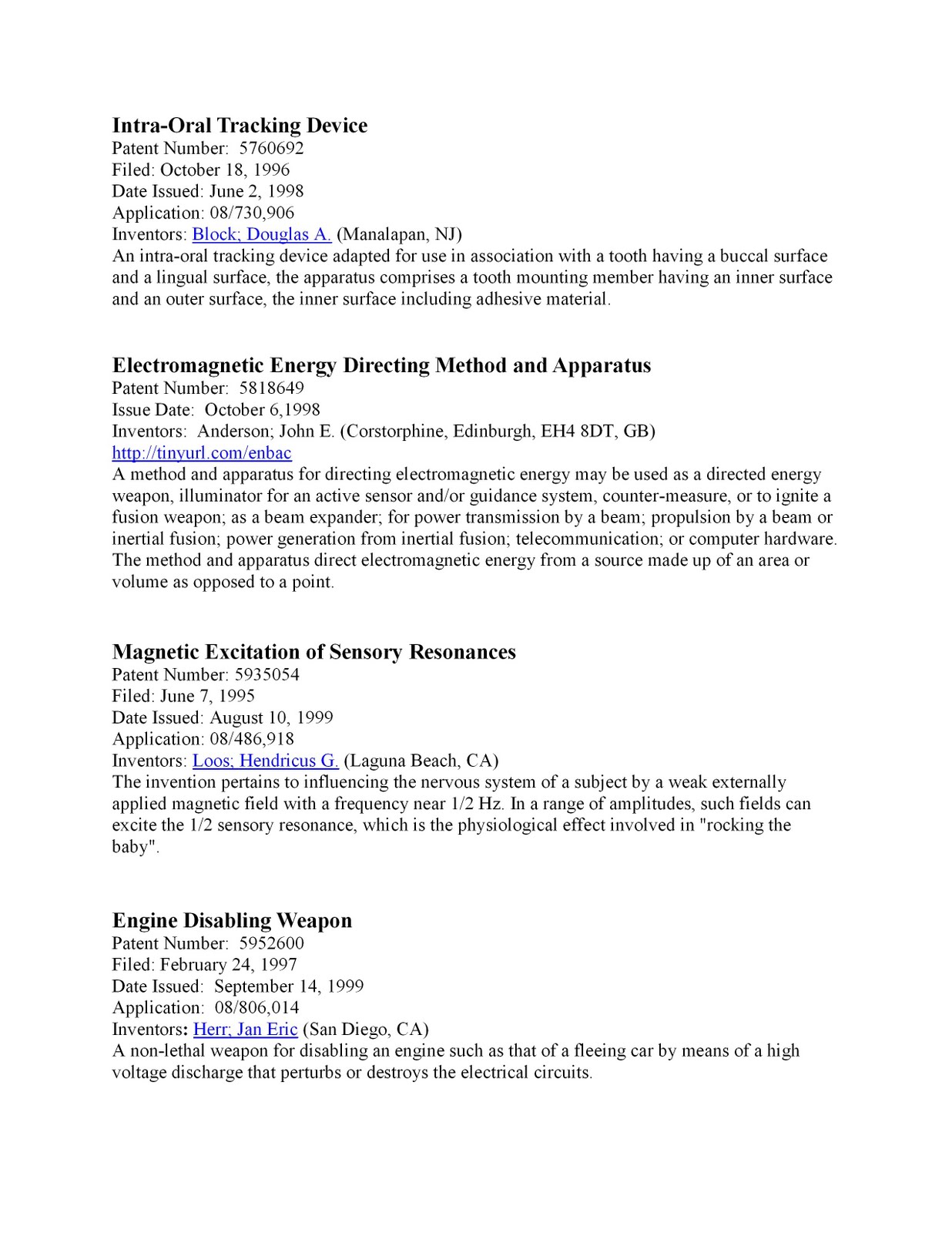 “Lida”技术:脉冲射频发射器,可以导致严重的疲劳和昏睡,或者失眠。可以穿墙瞄准目标发射. LIDA技术在1950年代由苏联发明,后来在各国得到了发展。声音直达大脑(Voice to skull)技术:可以传送说话声和其它声音,直达目标的头部,旁边的人听不到,可以穿过墙壁发射。该技术可以在没有脑控芯片的情况下实现。(该技术的美国军方代号是“V2K”。)